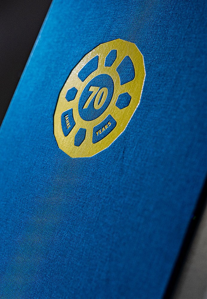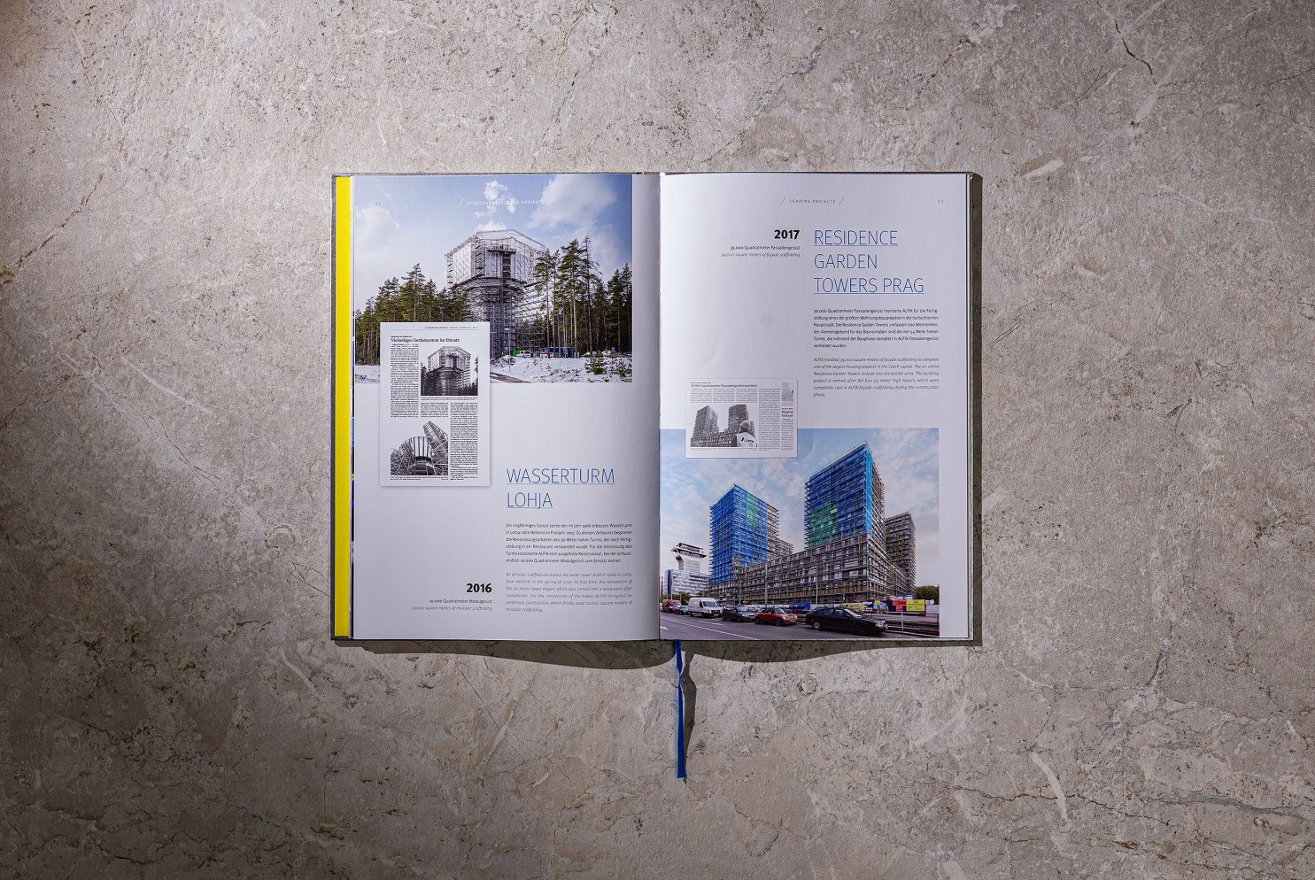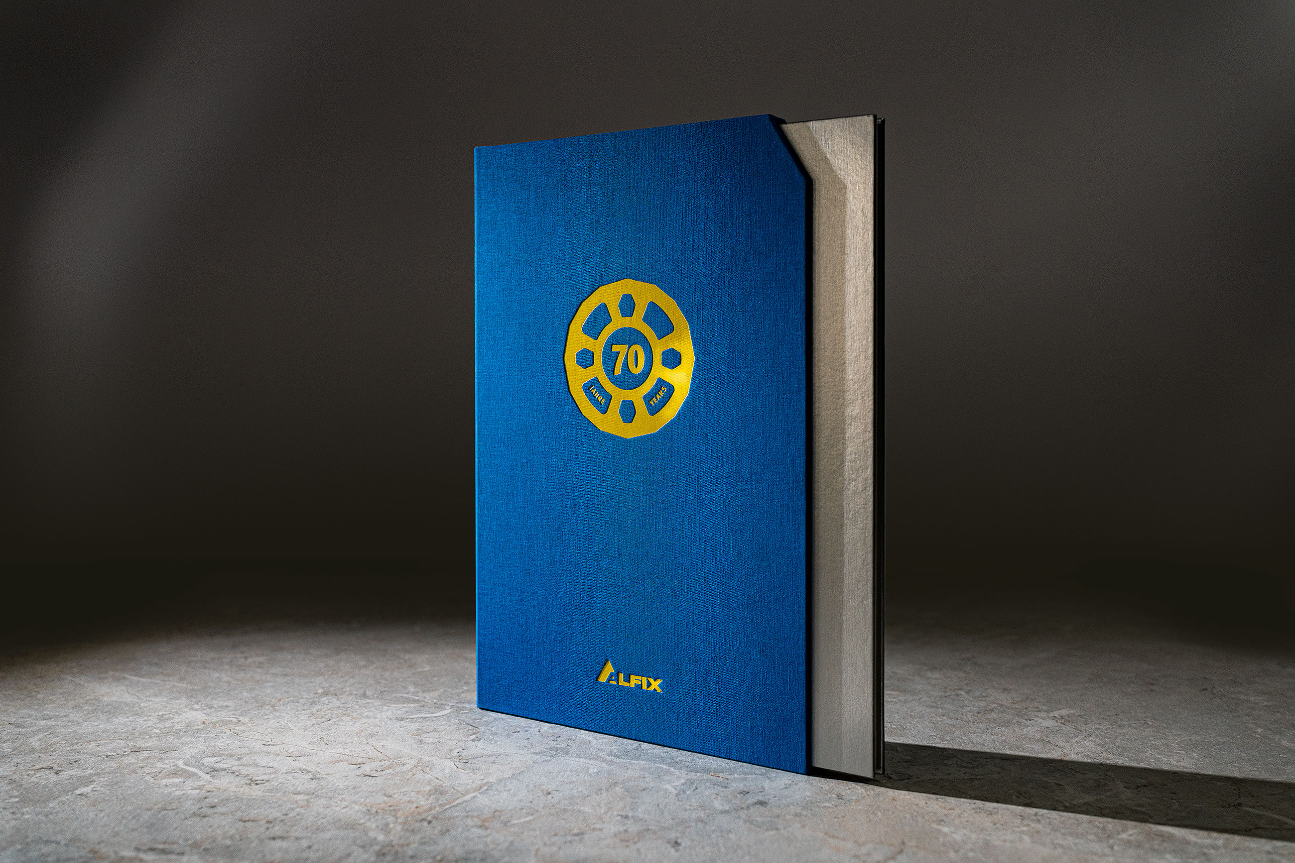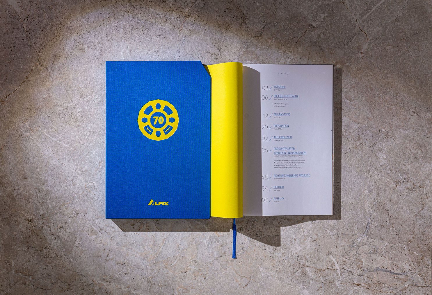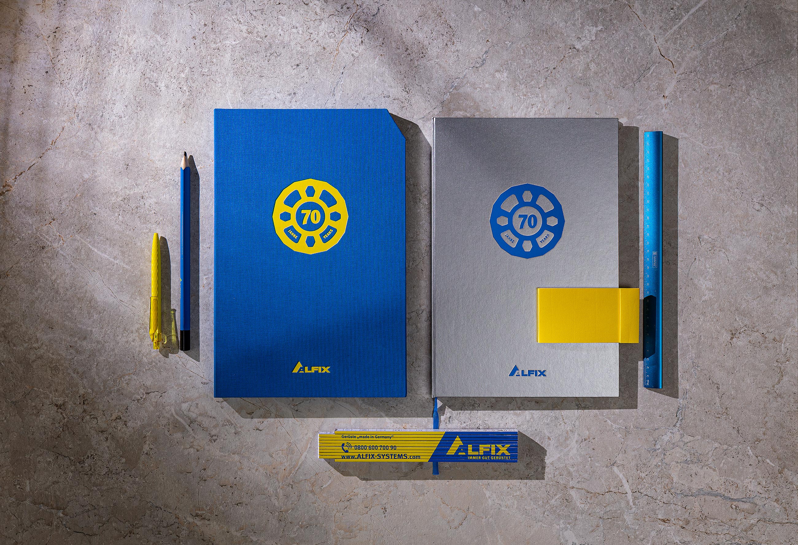 Für das 70-jährige Jubiläum erhielten wir die ehrenvolle Auftrag eine ansprechende Unternehmensbroschüre zu fertigen. In dieser sollte neben der kompletten Produktpalette auch die wichtigsten Meilensteine in der Geschichte des Unternehmens repräsentativ dargestellt werden. Zu diesem Zweck visualisierten wir die verschiedenen Gerüstsysteme als hochauflösende 3D-Darstellung. Das Exposé wurde mit einen farbigen Vor- und Nachsatz mit Fadenheftung gefertigt und erhielt einen Hardcover Umschlag mit einer Oberfläche die an gebürsteten Stahl erinnert. Hinzu kam ein mit leinenbezogener Schuber in den markanten Hausfarben des Unternehmens. Eine Heißfolienprägung in Form des von uns entwickelten Jubiläumslogos auf dem Titel von Exposé und Schuber, runden das hochwertige Erscheinungsbild ab. Im Zuge der Jubiläumsveranstaltung unterstützen wir das Unternehmen auch in der Gestaltung weitere hochwertiger Kommunikationsmittel