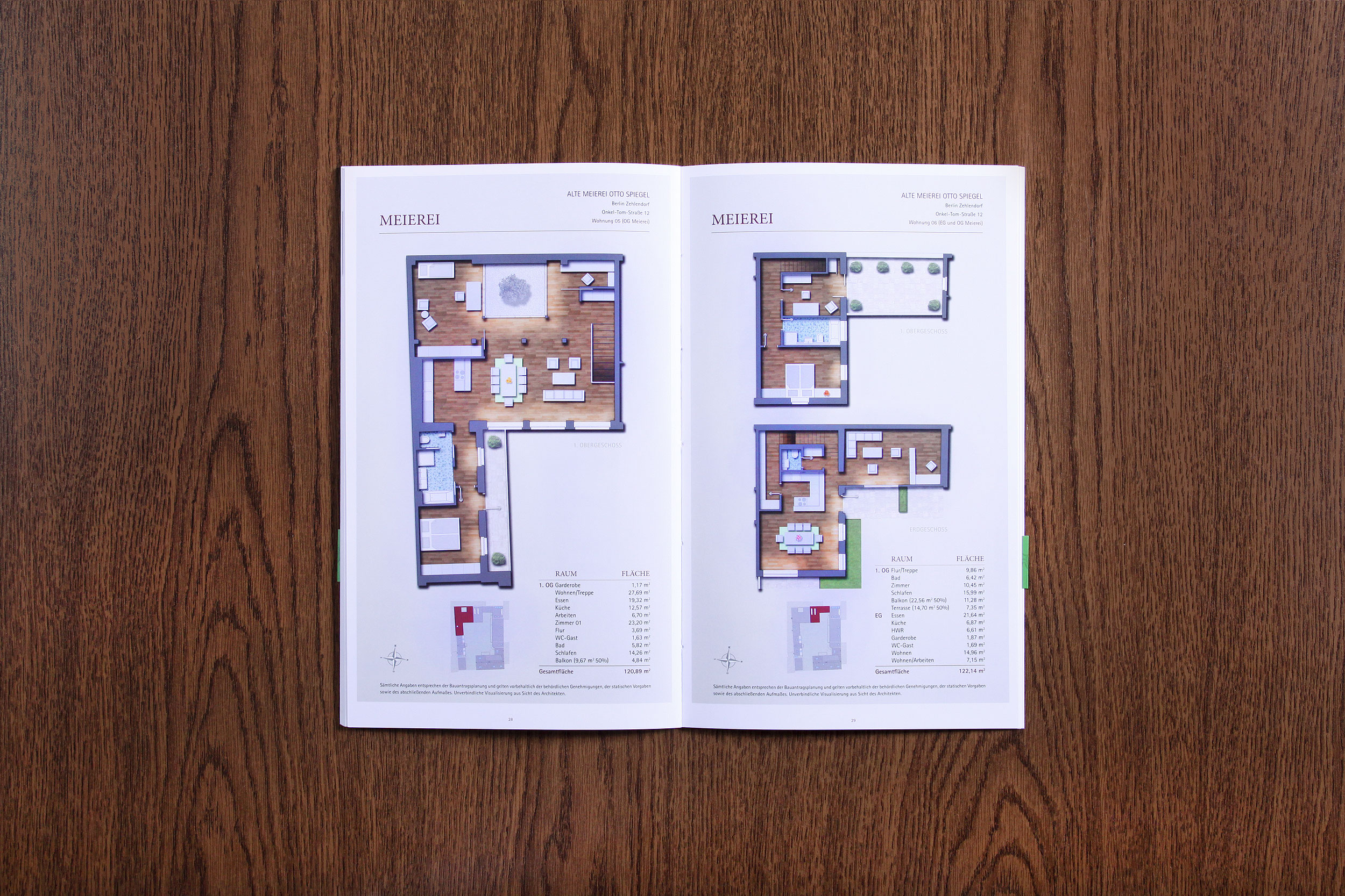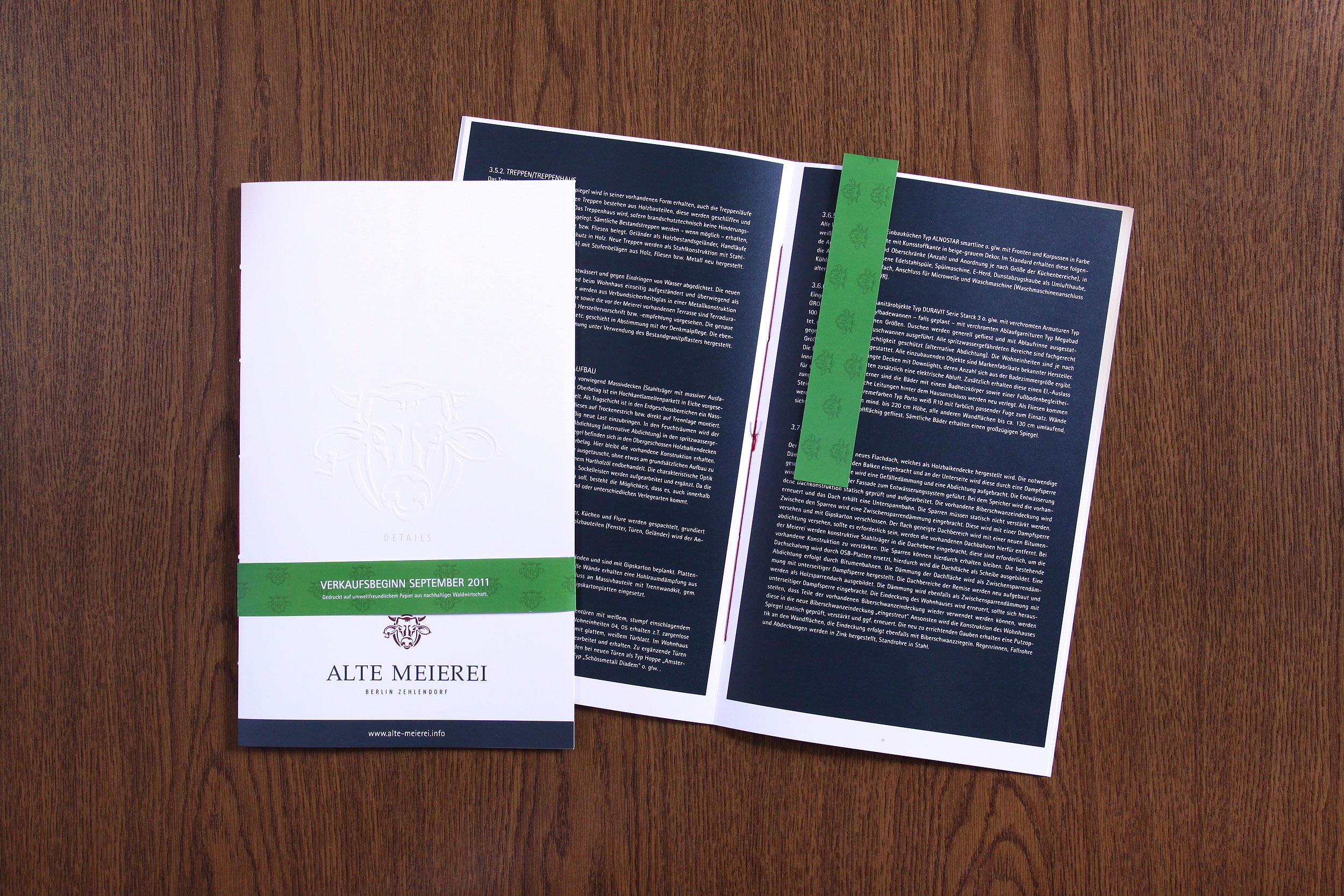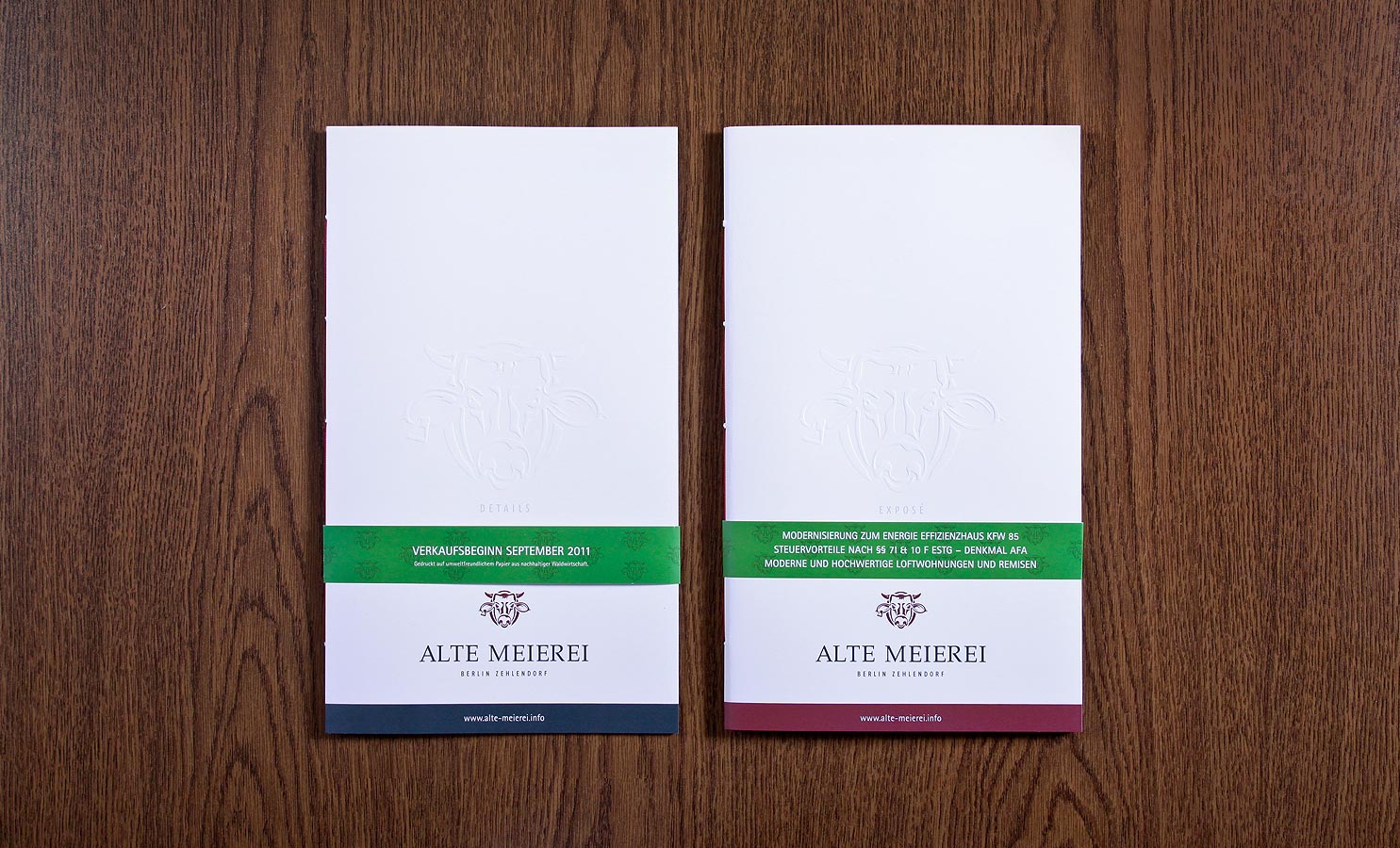 Detailverliebt wie das Objekt selbst entwickelten wir für das Projekt "Alte Meierei" in Berlin Zehlendorf eine visuell opulente Website auf der Basis von HTML und JavaScript mit individuell programmiertem CMS-System. Ein 44-seitiges, hochwertiges Exposé mit ergänzender Baubeschreibung bildete hierbei das haptische Gegenstück. Gedruckt auf Garda-Pat Kiara 13, hinterlassen beide Broschüren einen überaus wertigen Eindruck, welcher noch durch eine Mattfolienkaschierung, Blindprägung der Wortmarke und eine Banderole gesteigert wird. Hochauflösende Fotografie, fundierte Redaktion und detailgetreue Renderings durch das Berliner Architekturbüro Ferber Architekten ergänzten harmonisch das neu entwickelte Corporate Design dieser außergewöhnlichen Immobilie.