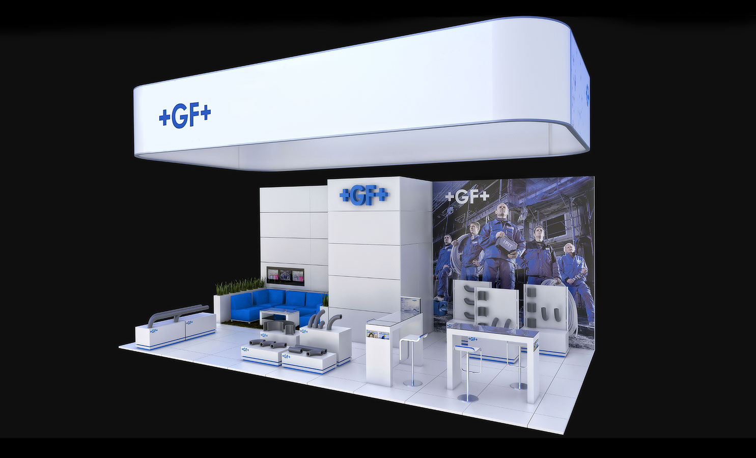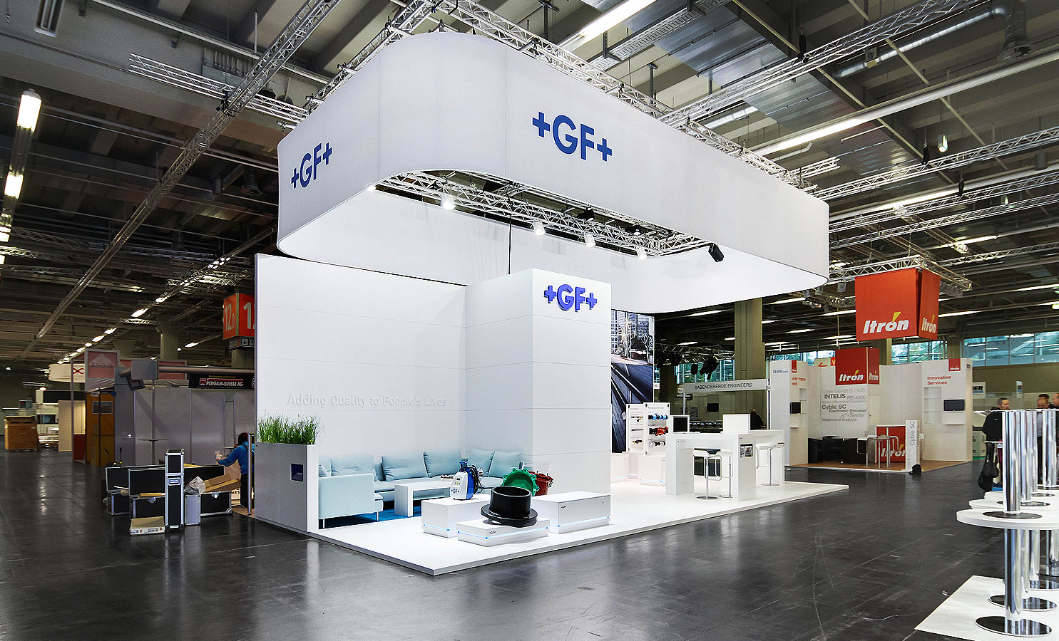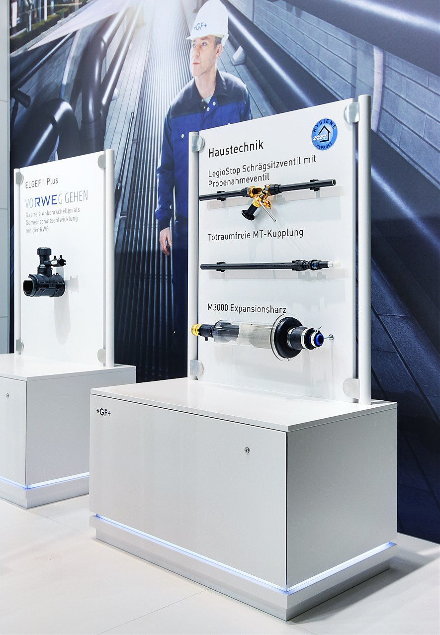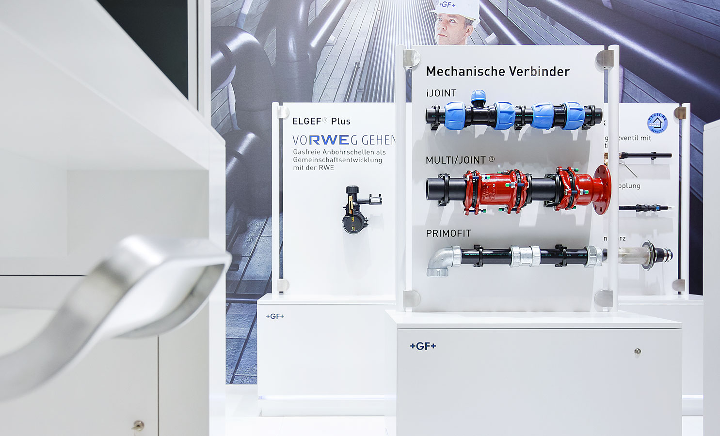 Für die 67. Ausgabe der Fachmesse für Gas und Wasser in Nürnberg entwickelte dreipunkt ein ansprechendes und funktionales Standkonzept für einen 60 qm großen Messestand des Ausstellers Georg Fischer AG. Unter Verwendung des neu definierten Corporate Designs und unter Einsatz hochwertiger Möbel und grafischer Elemente aus eigener Fertigung setzten wir den Aussteller und seine Produkte erstmals neu in Szene.