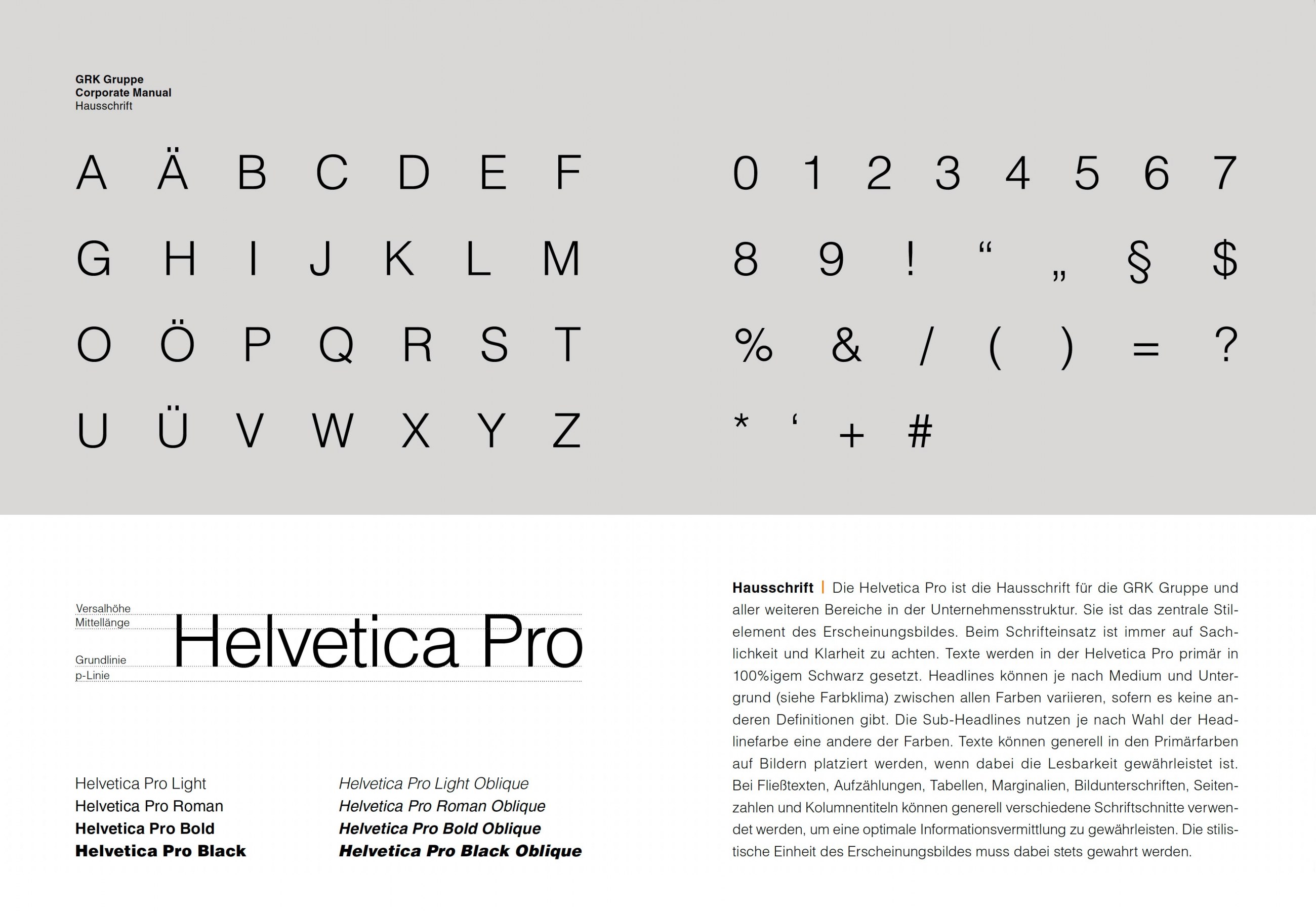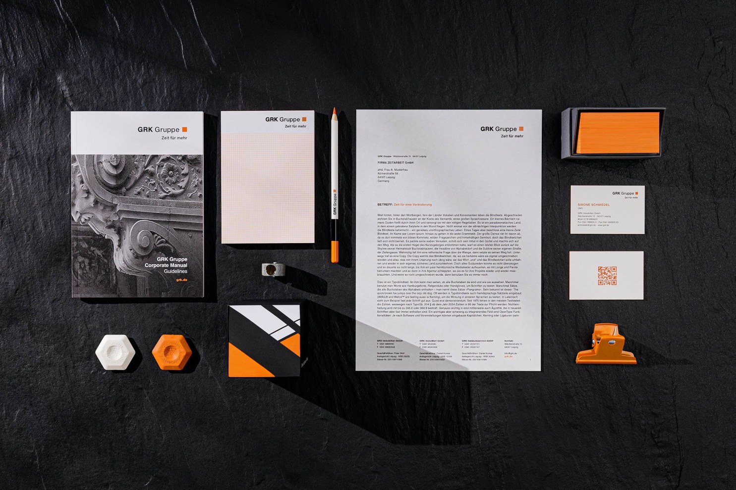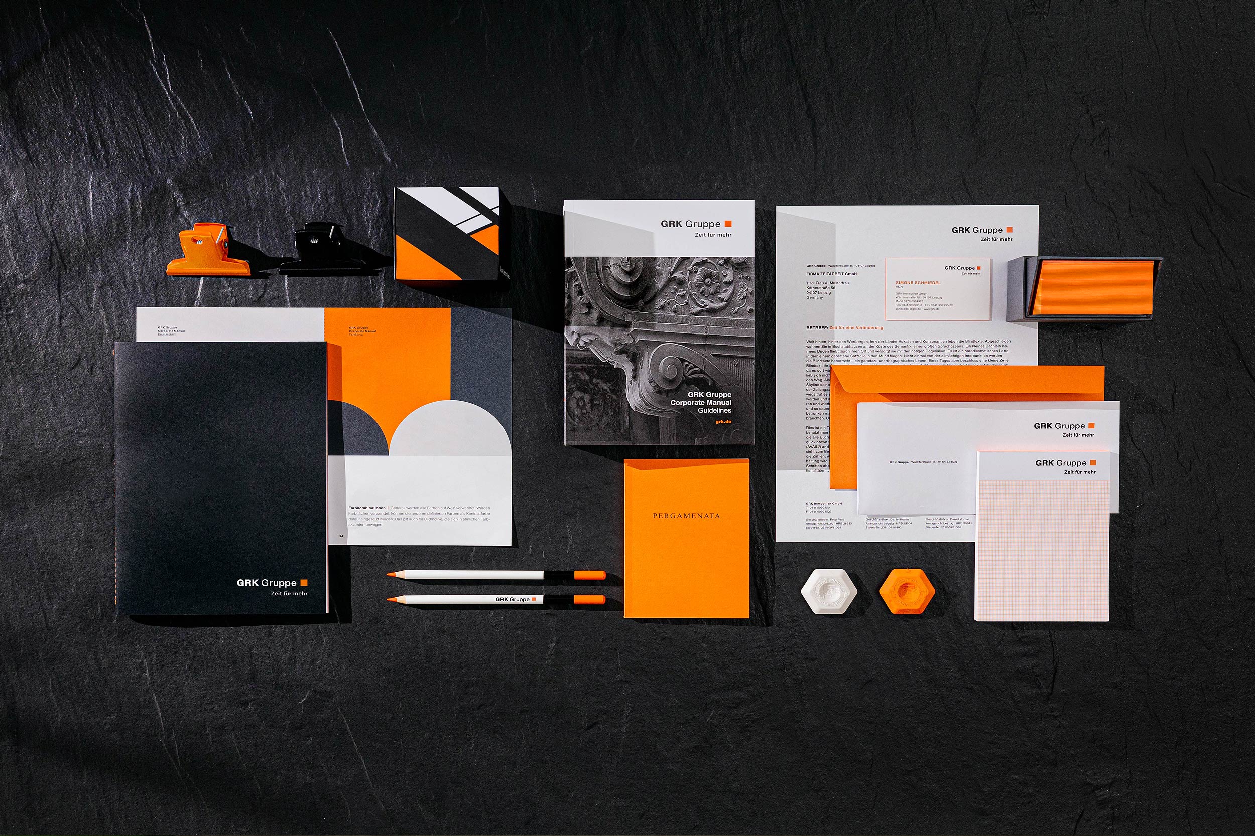 Seit über 30 Jahren steht die GRK Gruppe für die Entwicklung hochwertiger Immobilienprojekte und deren professioneller Betreuung. Die Unverwechselbarkeit des Unternehmens erwächst vor allem aus der Vielfalt seiner Geschäftsbereiche und die Kompetenz seiner Mitarbeiter. Um das Unternehmen einheitlicher und mit optimierten Strukturen zu positionieren, bestand der Wunsch des Kunden, die unterschiedlichen Firmen grafisch unter einer neuen Dachmarke mit dem Namen „GRK Gruppe“ zu vereinen. Unter konkreten Vorgaben des Kunden wurde die vorhandene Marke sanft überarbeitet und eine neue Dachmarke mit dem Claim „Zeit für mehr.“ kreiert. Anschließend wurden die definierten Vorgaben für Proportionen, Farben und Typografie in einem umfassenden Corporate Design Manual festgehalten. In gedruckter und handgebundener Form dient dieses Manual nun jeden Mitarbeiter als passendes Werkzeug für einen einheitlichen Markenaufritt.