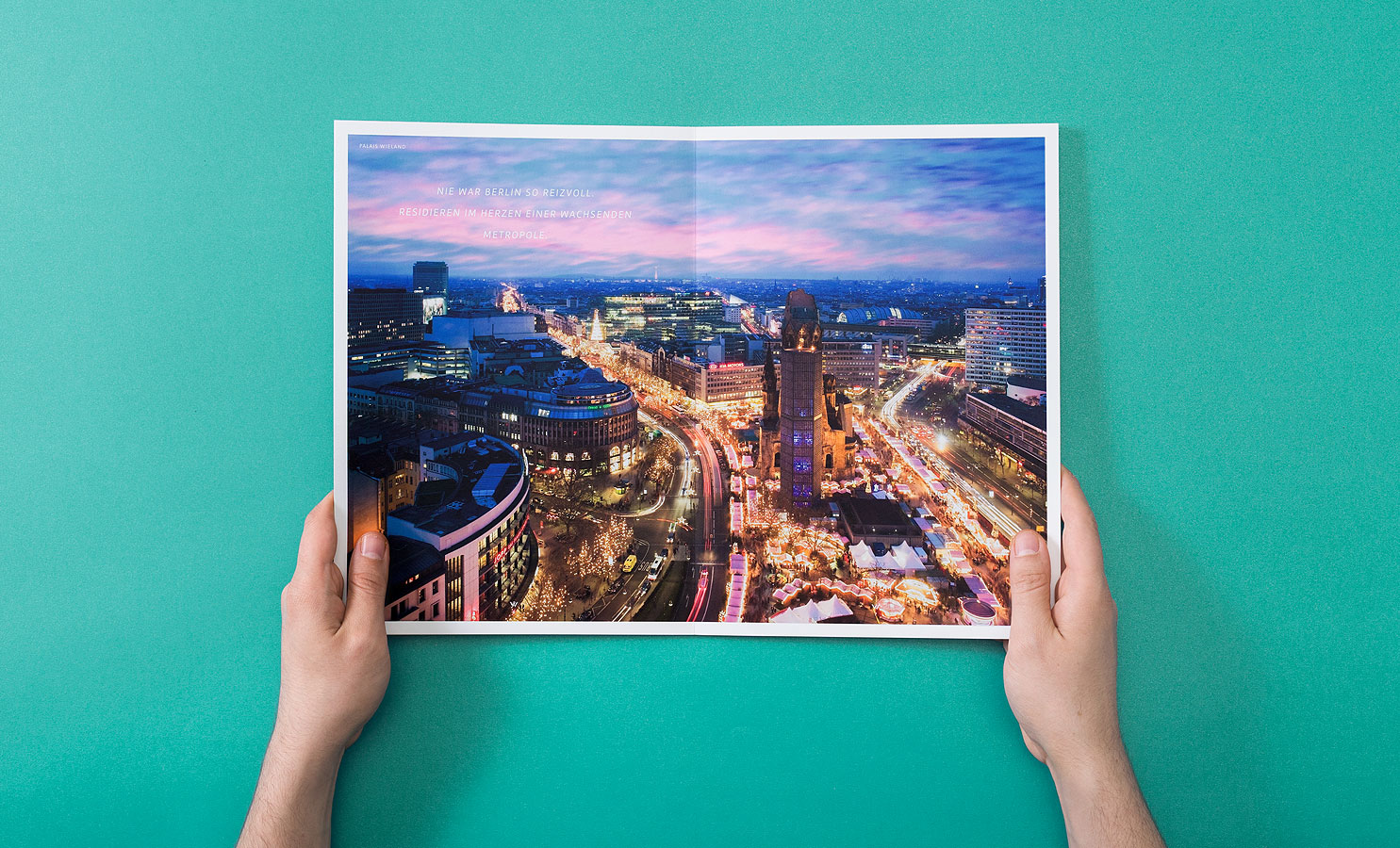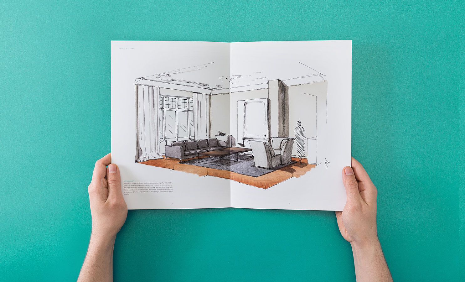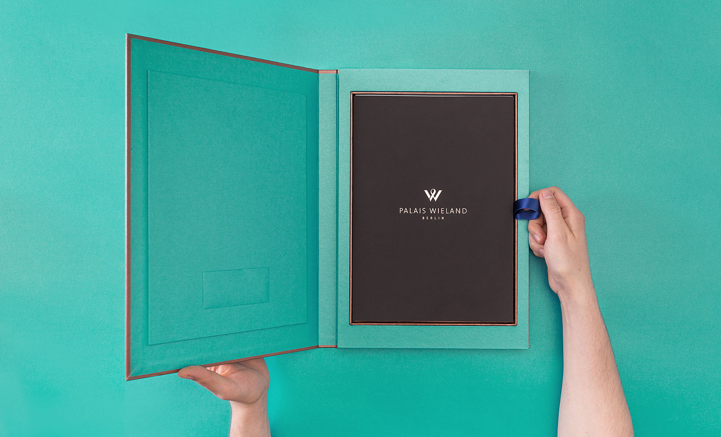Unseren langjährigen Erfahrungen in der Erstellung hochwertiger Vermarktungsinstrumente für außergewöhnliche Immobilien folgend, entwickelte dreipunkt unter dem Namen "Palais Wieland" ein einheitliches Vermarktungskonzept für eine hochwertige Immobilie in Berlin Charlottenburg. Unsere Leistungen umfassten die Konzeption einer Wort-/Bildmarke, die Definition einer einheitlichen Bilderwelt, die Gestaltung diverser Planen und Folder, die Entwicklung eines exklusiven Exposés und die Erstellung einer Projektwebseite. Das Exposé in limitierter Auflage mit 40 Seiten Inhalt wurde im digitalen Druckverfahren auf Feinstpapier des Herstellers Metapaper gedruckt. Highlight ist die patentierte Bindung ohne störenden Rücken für eine verlustfreie Betrachtung der großformatigen Motive. Ein sechsseitiger Schutzumschlag aus durchfärbtem braunen Feinstpapier der Sorte Plike mit kupferfarbener Heißfolienprägung der Wortmarke ergänzt den außergewöhnlichen Look des Exposés. Gekrönt wurde das Projekt durch einen einzigartigen Schuber aus kupferfarbenem Corvon Metallic des Herstellers Winter & Company und aus Feinstpapier Sirio Pearl der italienischen Papiermanufaktur Fedrigoni. In diesem limitierten Schuber im Sonderformat fand abschließend das Exposé des "Palais Wieland" seinen angestammten Platz.
