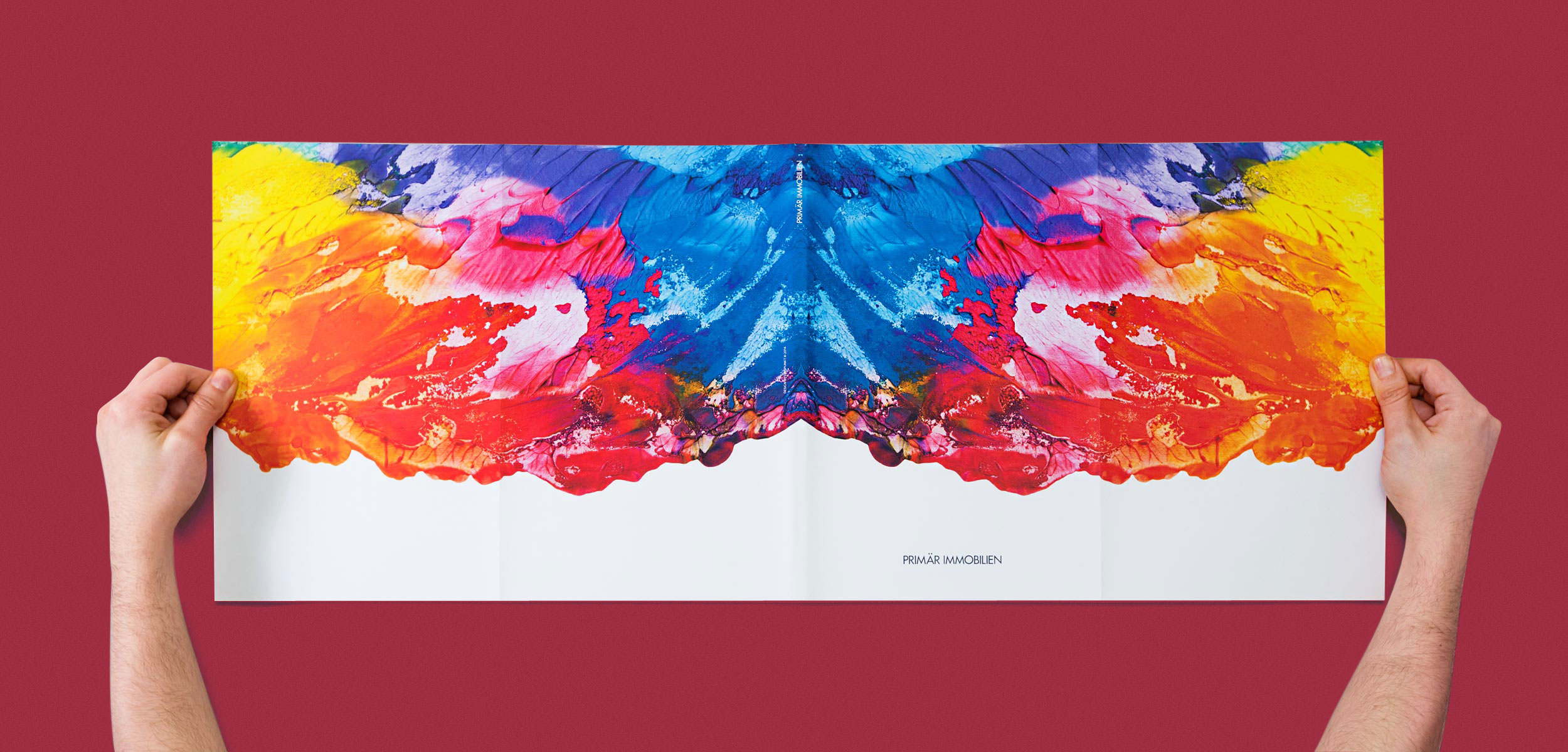 Im Frühjahr 2013 beauftragte uns das Berliner Maklerbüro „Primär Immobilien“ mit der Gestaltung und Produktion einer hochwertigen Unternehmensbroschüre. Die Aufgabe bestand in der Präsentation bereits realisierter und noch in Planung befindlicher Wohnbauten und einer kurzen Unternehmensdarstellung. Für den Umschlag der Broschüre erstellten wir einen wilden Farbmix aus Ölfarbe, welcher die Affinität des Inhabers zur modernen Malerei charmant aufgreift. Das gedruckte Ergebnis ist eine hochwertige Broschüre im Sonderformat mit 120 Seiten Inhalt in handgebundenem Festeinband mit leinengebundenem Rücken. Der Inhalt brilliert auf 130 Gramm Focus Art von Papyrus, welches die haptischen Eigenschaften eines Naturpapiers mit der brillanten Farbwiedergabe gestrichener Papiere perfekt verbindet. Geschützt wird die stabile Broschur durch einen vierseitigen Schutzumschlag, gedruckt auf Rives Tradition des Herstellers Papier Union. Dieser simuliert die eigentümliche Oberflächenstruktur eines mit Canvas bezogenen Bilderrahmens und schafft somit die perfekte Illusion eines handgemalten Kunstwerks. Um das Buch auch auf Dauer zu schützen, spendierten wir noch einen in blaues Leinen gebundenen Schuber mit einfarbiger Heißfolienprägung. Ergänzt wurde dieses Projekt durch einen themenbezogenen Folder und eine hochwertige Angebotsmappe aus 600 Gramm gefärbtem Gmund Cotton mit rotem Gummiverschluss, in dem die Broschüre, alternativ zum Schuber, ihren wohlverdienten Platz findet.